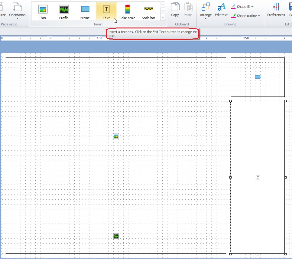 Insert - All available elements to insert in the plot are found in the Insert group. Click any of the items to start drawing. Then drag the shape to the desired location. Size and location can be changed by dragging the handles.
