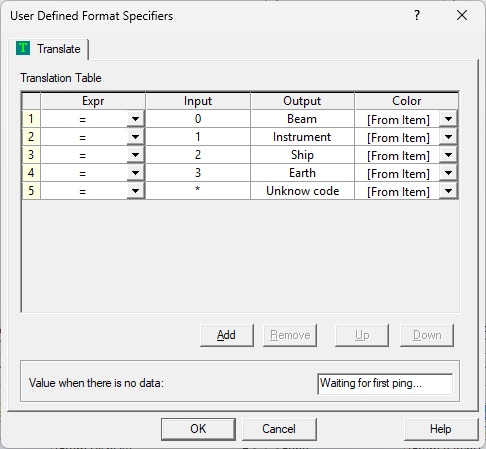 | Coordinate System | Flag that represents the current selected coordinate system for the individual velocity values. 0 means velocities per individual beam 1 Velocities relative to the ADCP instrument (X, Y, Z direction) 2 Velocities relative to Object (Ships Starboard/Forward,Mast direction) 3 Velocities relative to Earth (Easting, Northing, Up direction) | integer | You may define a translation table in order to translate the number codes into readable text.