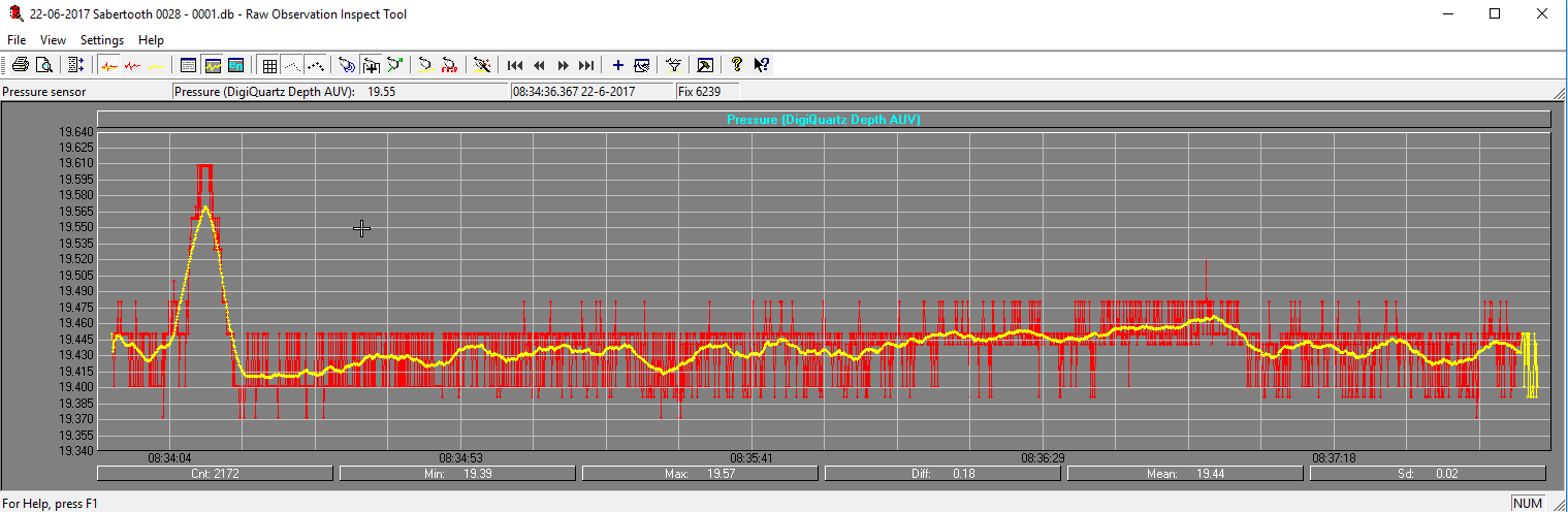 The red line in the time plot below shows the recorded data of the pressure sensor. The data is quite 'jumpy', the accuracy is quite low and this will affect the data quality.