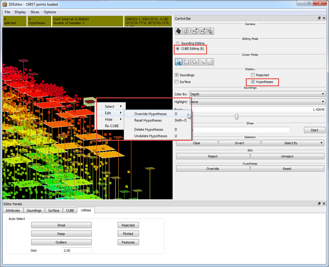 Make any necessary adjustments to the CUBE surface by selecting areas, launching the 3D Editor, and Overriding Hypotheses, adding Custom Hypotheses, or deleting points when no good hypothesis is available.