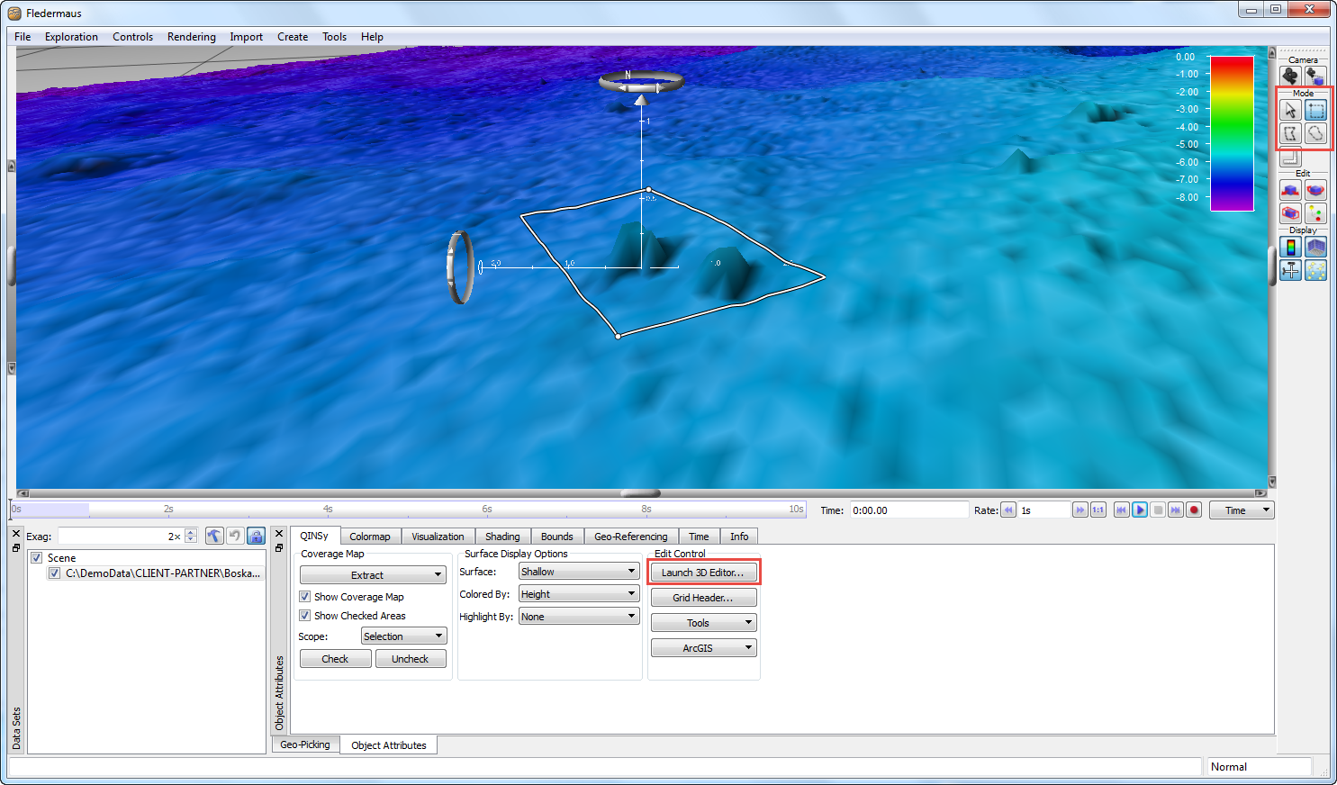 Once Fledermaus loads, select the Dynamic Surface you want to be brought into FM for editing. The coverage map for your survey will be visible. Use the Select Mode button:
