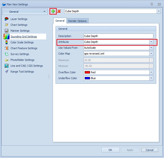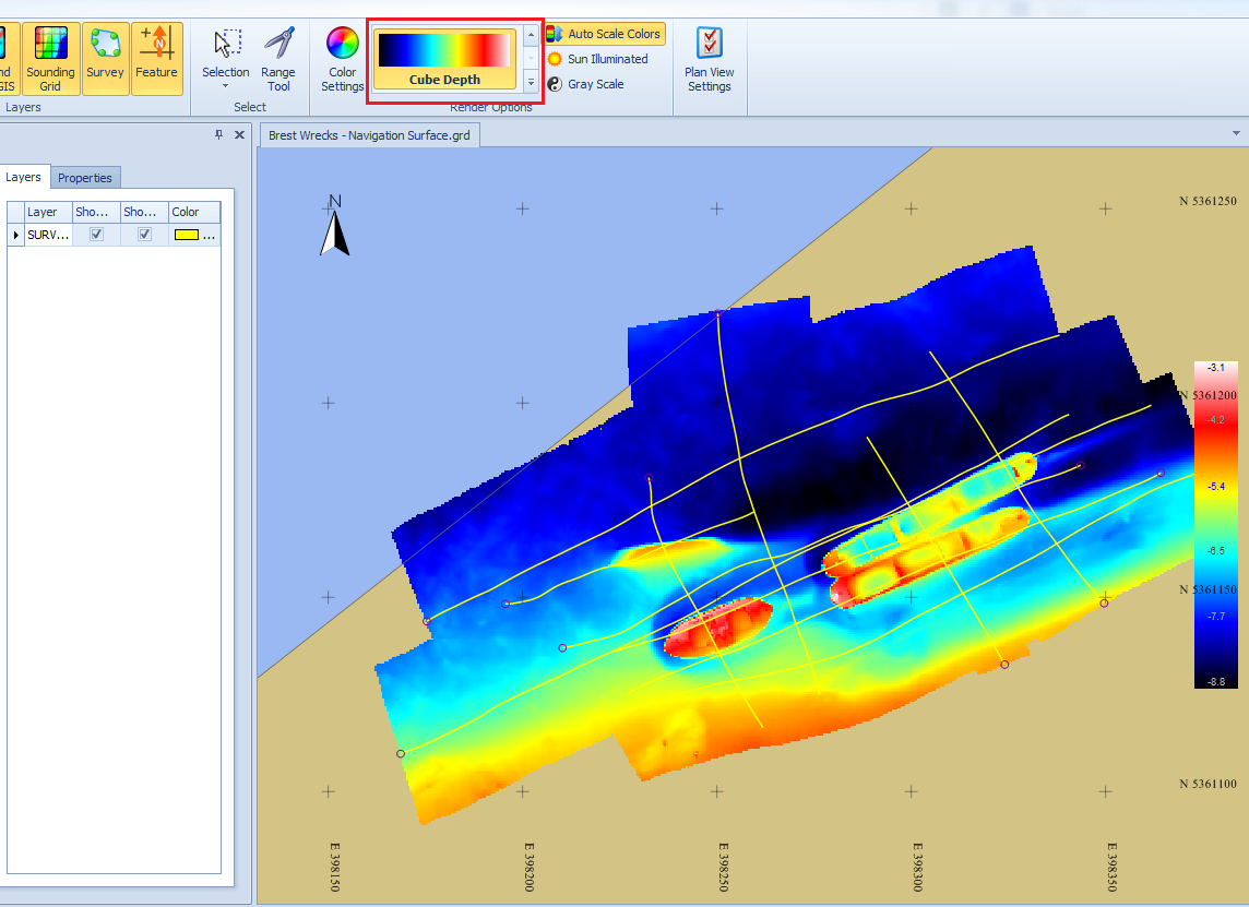Go to Color Settings in Home menu, add the Cube Depth attribute to the Sounding Grid attributes list, and see how the CUBE depth applies to the Dynamic Surface in Plan View.