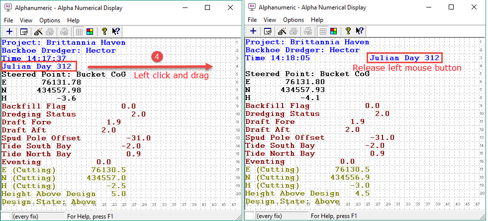 Center E, N, H | Easting, Northing and Height of the center of the dredge head. |