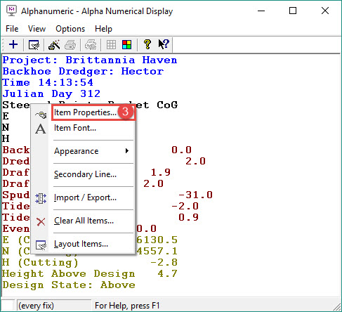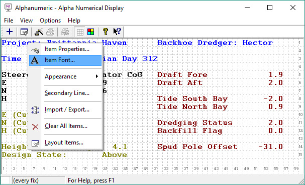 On completion of the wizard, selected items are shown in the Display itself. At that point the properties and font of any item are editable by right clicking on the item and selecting from the context menu.