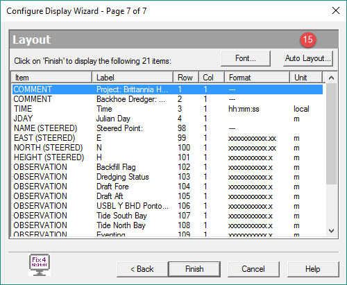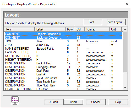 ![]() | Item Properties - modification of item name, location (by row and column numbers), number format, units and multiplication factor. Item Font - modification of font, font style, size, effect (strikeout/underline) and script. Appearance - turn grid on/off and change background color. Secondary Line - there may be occasions when one object is referenced to the main line, and a second line is need as reference for a second object. Use this option to select the secondary line. Import/Export - once completed a layout may be saved to a configuration file which can later be imported when required, so avoiding a repeated setup procedure. Clear all items - does what it says. Layout Items - opens the layout wizard on Page 1. |