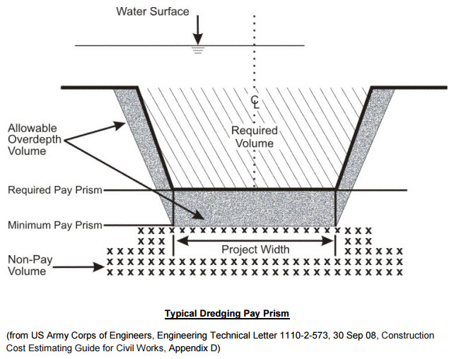 Total dredging quantities comprise required volume, overdepth quantity dredged, and incidental non-pay yardage dredged.