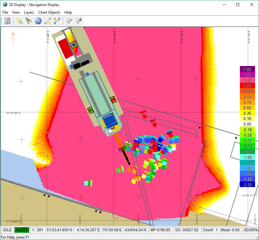 In the Navigation Display you see that the operator needs to excavate until all the red and yellow is replaced with light green. Some areas in blue are over-dredged.