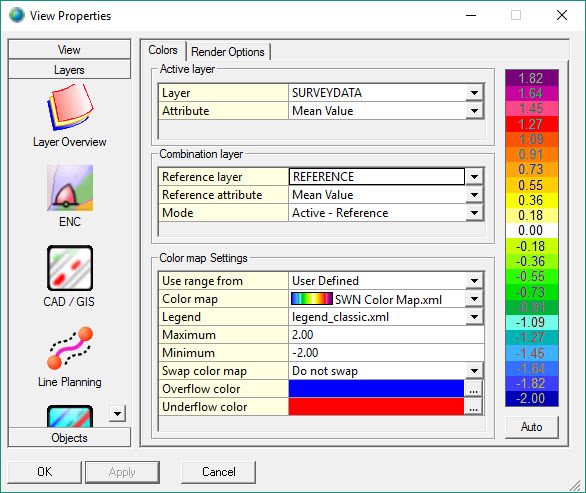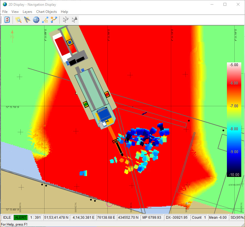Using a reference layer means that it has been pre-populated with data. Pick one of the existing layers from the drop down list to make a comparison. For example a reference layer may contain a pre-dredge DTM to be compared with a post dredge DTM, or a channel design surface to compare with a dredged surface. The functionality is also useful in assessing sediment migration. Surface differences are computed and color mapped in real-time as the second survey data is acquired.