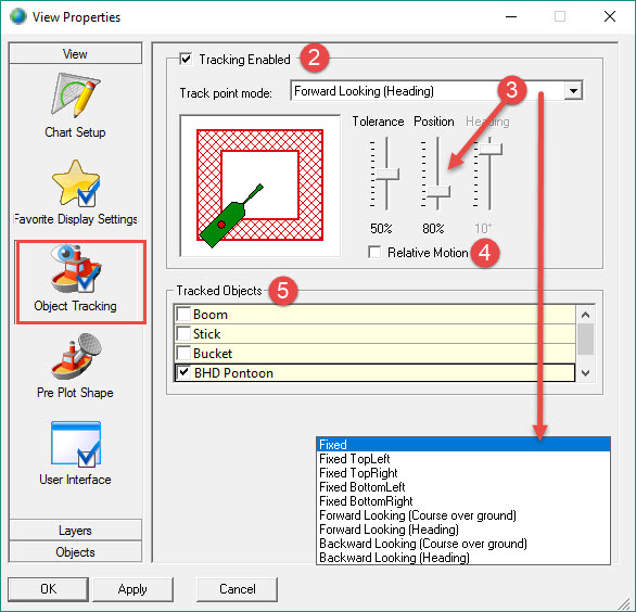 Select Tracking Enabled in order to automatically track an object in the Navigation Display. This keeps the focus on the selected object at all times. Scale will change automatically to keep all selected objects in view.