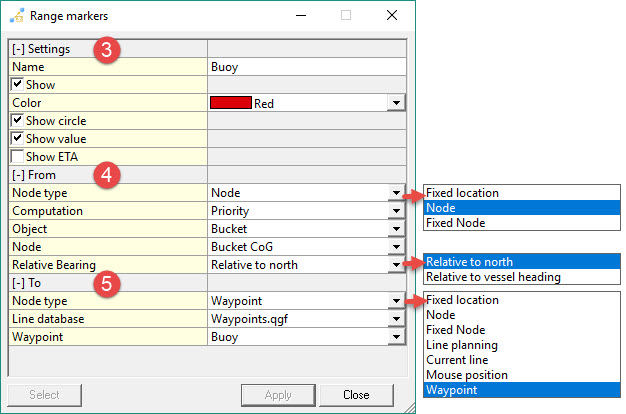 Use a Range Marker to see a continuous range and bearing measurement between two points. For example from a Node on a vessel to another certain position. Multiple range markers can be placed. All markers can be previewed in the Navigation Display by pressing Apply. Edits can then be made before closing the dialog.