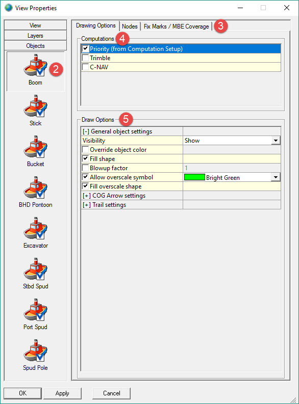 When the vessel shape as defined in Database Setup is too small to be drawn at the current display scale a default symbol for the object is drawn instead. Set a color for this symbol. For the smaller object shapes like the dredge head or spud poles it is better not to use the option “Allow Overscale Symbol”.