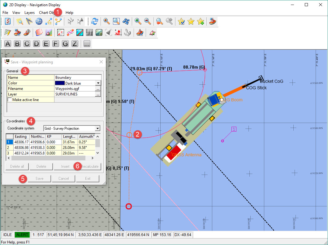 Save the setup of waypoints and legs in a *.QGF file. Waypoints and connecting lines (legs) are shown in the Navigation Display.