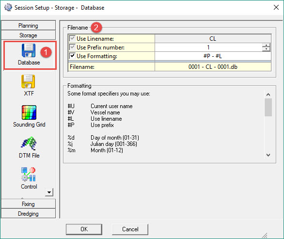 | Mode | The mode determines the name of the storage file: Use Database storage name - By Default and Recommended. The DTM file will have the same storage name as the raw data file. This is highly recommended, since some processing tools require a DTM file to have the same name as the corresponding database. User-defined name - User is able to enter a different file name. This is not recommended. |