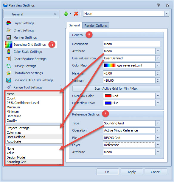 During data acquisition QINSy can be configured to maintain a track of various attributes per grid cell. If more than the Mean attribute was used select which should be presented in the View Plan. For dredging this is typically the Mean, i.e. the mean of the soundings in each cell