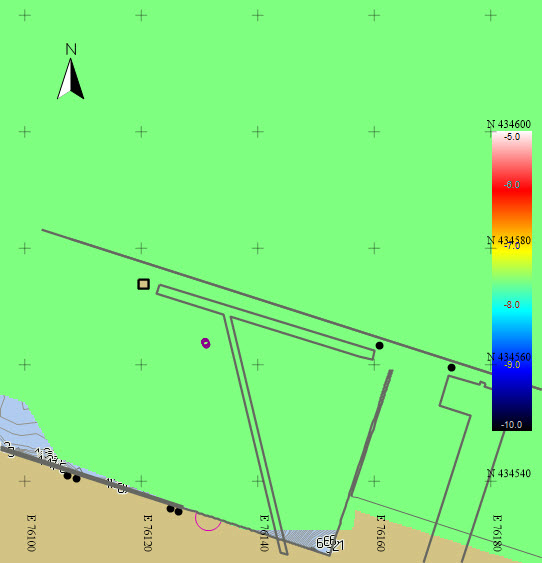 Dredged bathymetry layer (Max = -5.0, Min = -10.0)