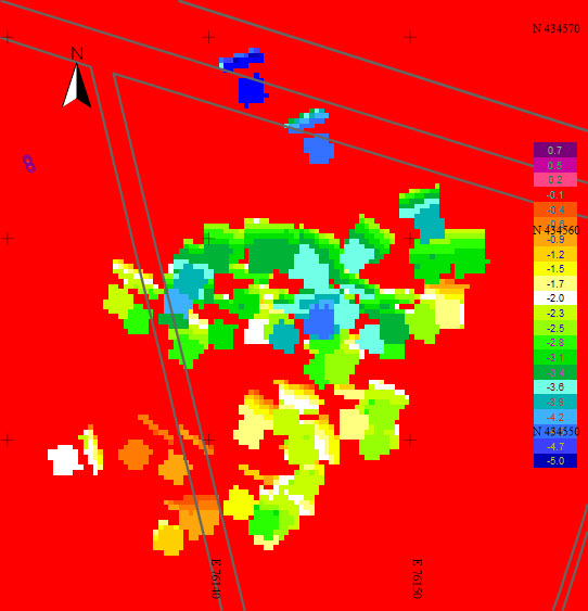Difference between Insurvey and Dredged bathymetry layers (Max = +1.0 Min = -5.0). Red indicates no difference.