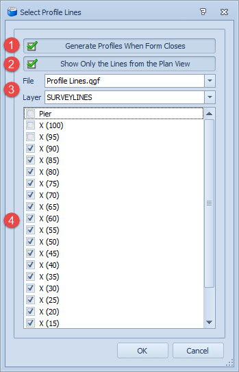 Use the Manage button in the Profiles tab to automatically generate a series of profiles. This opens the Select Profiles Lines dialog: