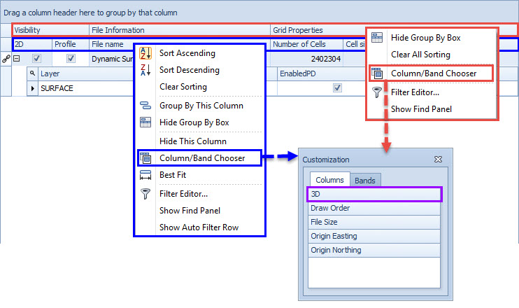 If that check box is not immediately visible, right click the upper column titles row (red outline) or in the second row of column titles (blue outline). Each shows a different menu but both contain the Column/Band Chooser. Both options lead to the same Customization dialog. Double click on 3D to load that column.