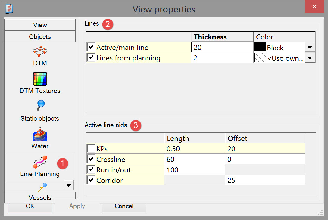 Switch on or off the visibility of all other lines set in the line planning. Set the thickness of the line in pixels as well as the color. <Use own color> leaves the line as it was defined in the program Line Database Manager or Processing Manager.