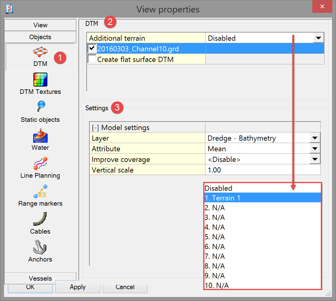 Select one of the layers from the DTM terrains list and set the properties of this layer in the Settings pane below.