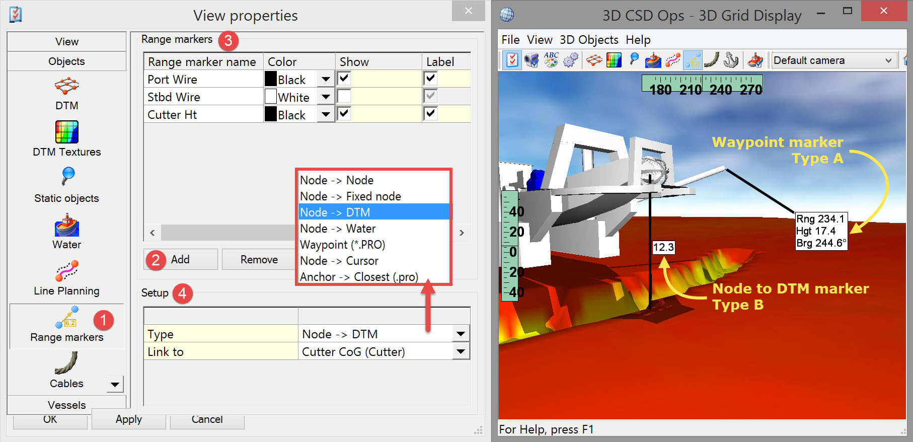 The 3D Grid Display shows multiple three dimensional objects simultaneously: DTMs with surface texture, static objects, water surface, range markers, cables, survey lines, anchors, and vessels (dredgers, dredge heads). Vessels are seen moving in real-time updating DTM depths as dredging proceeds, both excavating and dumping.