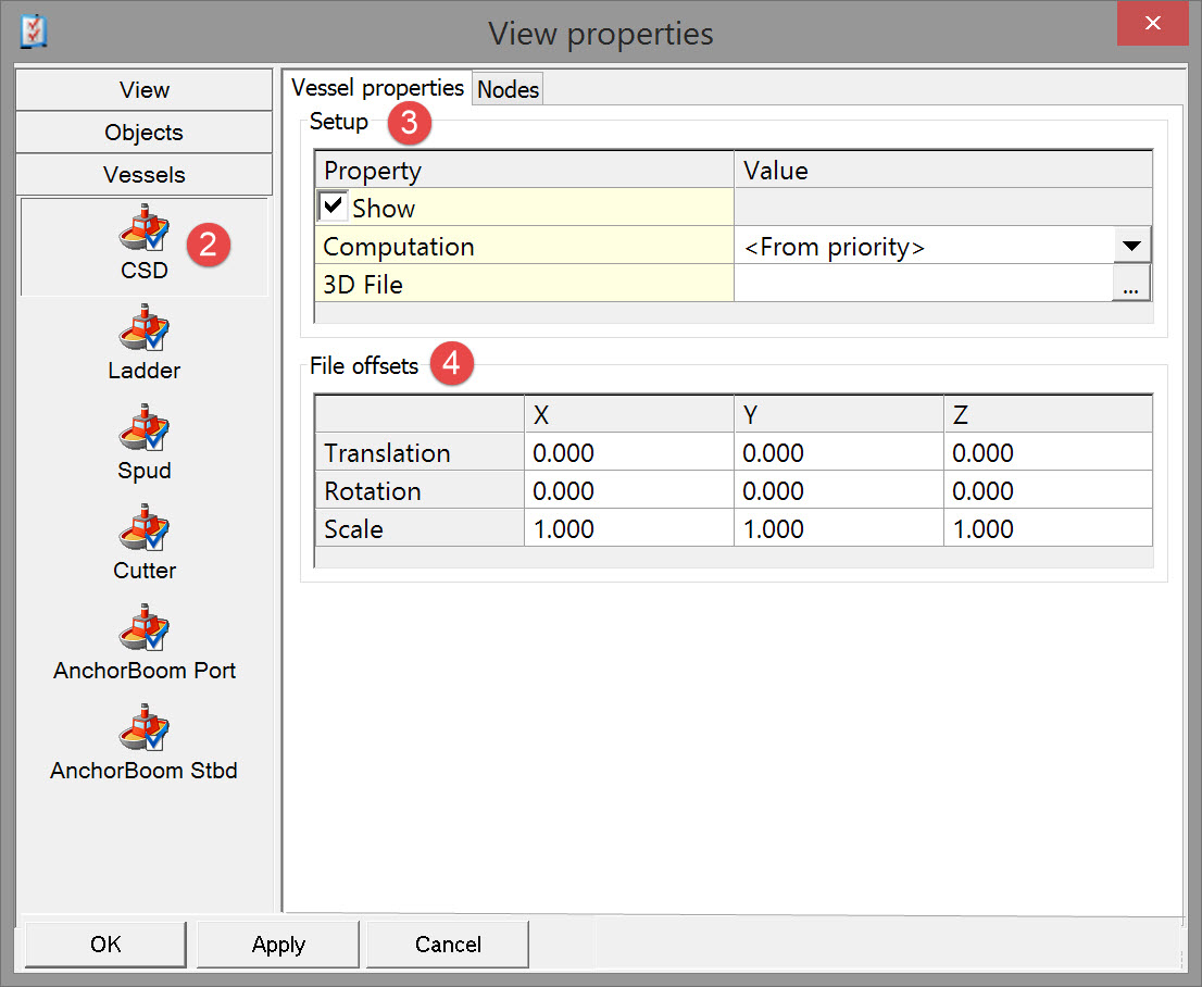 For a tracking camera these are the offsets of the camera from the object's reference node. In the example, the CSD pontoon reference point is at the aft end. Therefore to view the cutter a Y offset of 60m. is entered to shift the camera position forward.