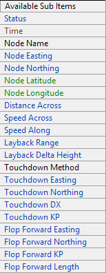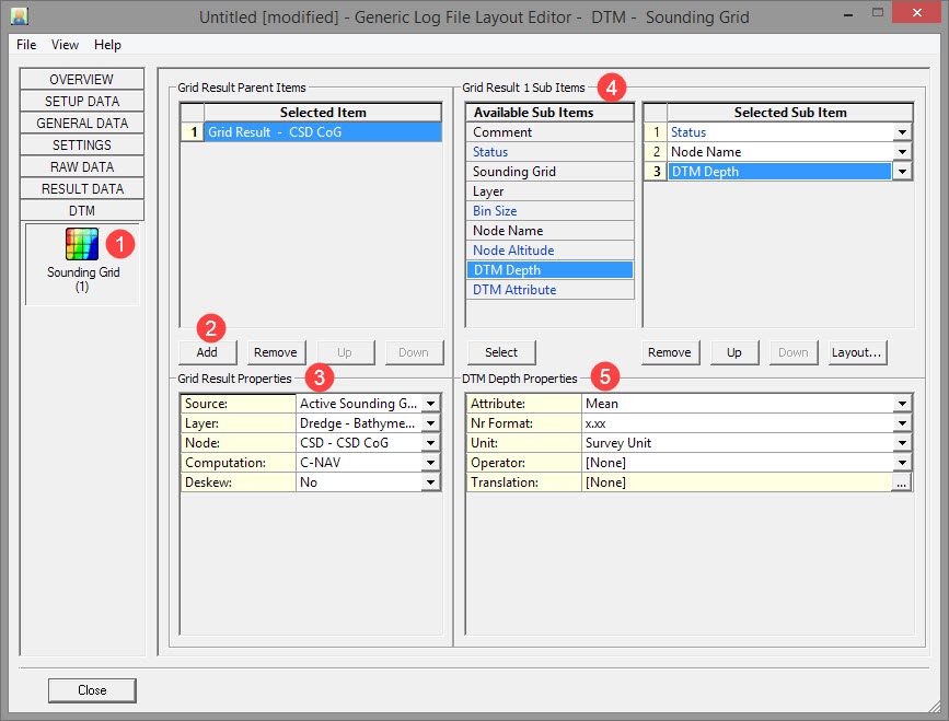 Node Name, Status and DTM Depth. Status: A number between 0 and 7 indicating the status of the selected Sounding Grid, Layer and / or Node 0 means all okay, a valid DTM value was extracted successfully for the current node position 1 means no active sounding grid file has been selected in the Controller's Session Storage Setup 2 means that no grid file was selected 3 means that the selected grid file was not found 4 means that no layer has been selected 5 means that the selected layer was not found in the current sounding grid 6 means that no node was selected, or that the selected node has no valid position 7 means that the current node position is inside a bin with no valid DTM values