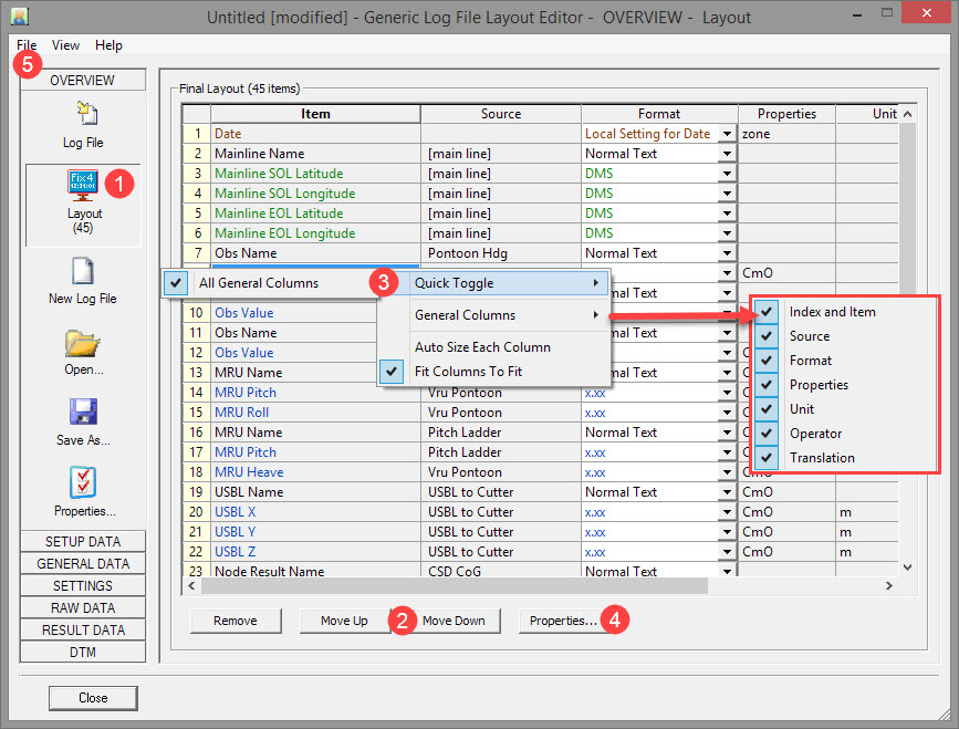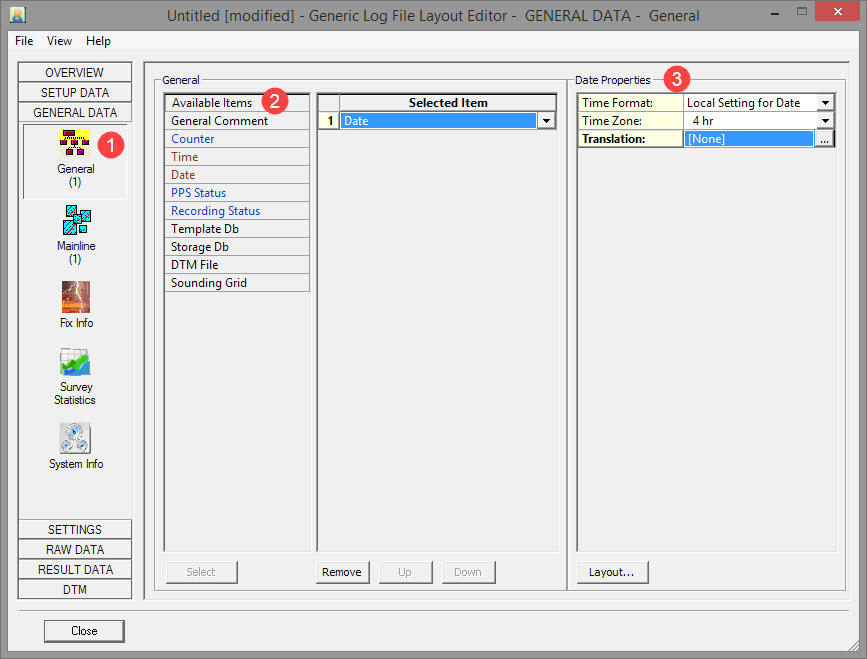 This section provides an example to illustrate the use of the Generic Layout Editor to create a Generic ASCII Data Logger. The items and sub-items chosen for logging to file are only to illustrate the selection procedure. Your particular situation in the field may be similar or significantly different. It really depends on the circumstances and the client's specifications.