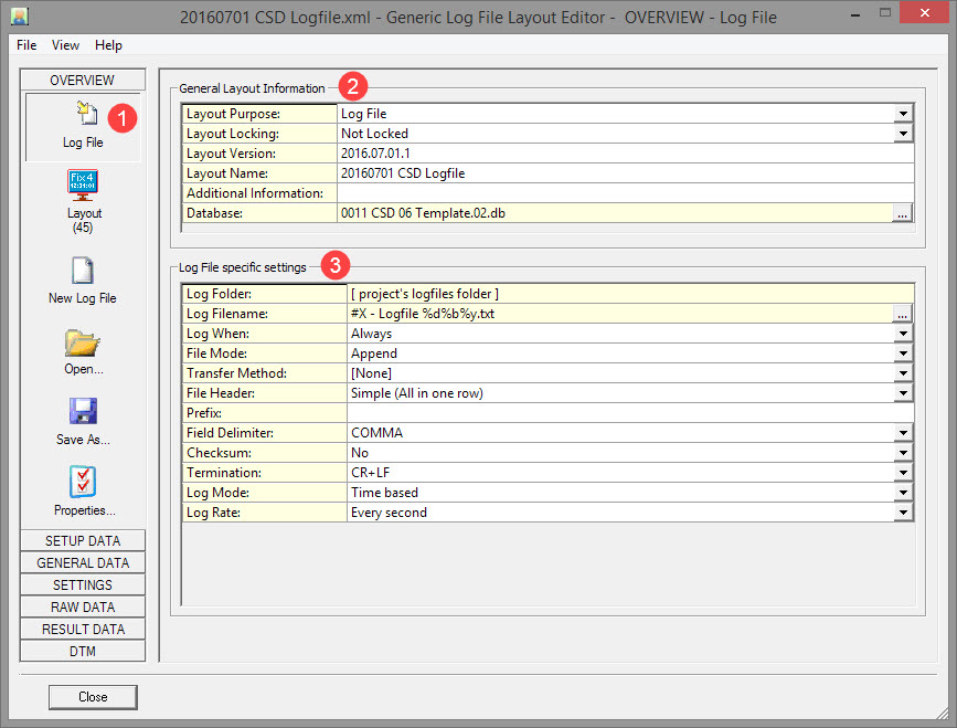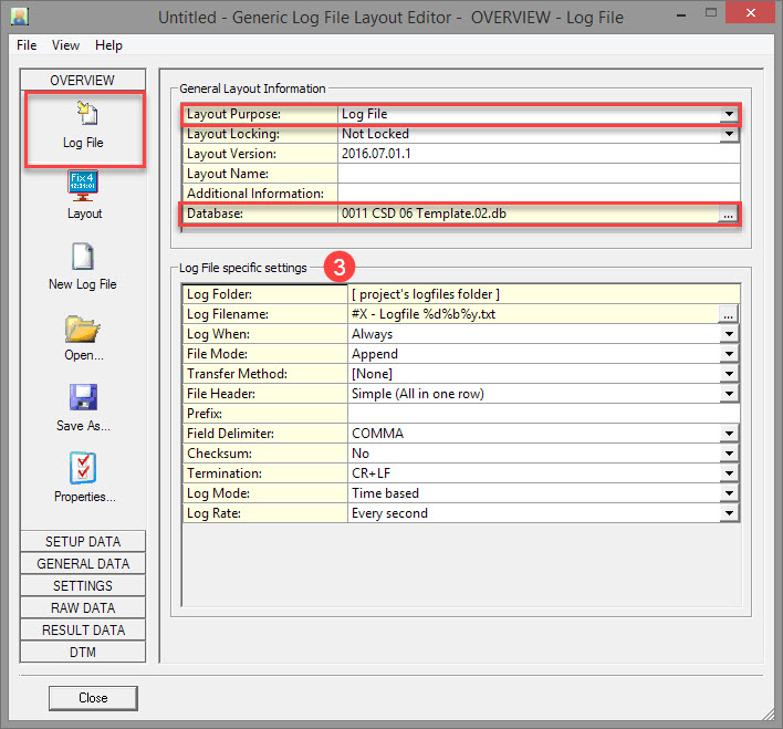 Log File specific settings determine characteristics of the data output string.