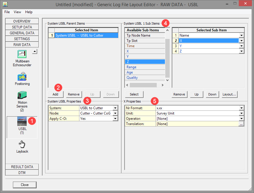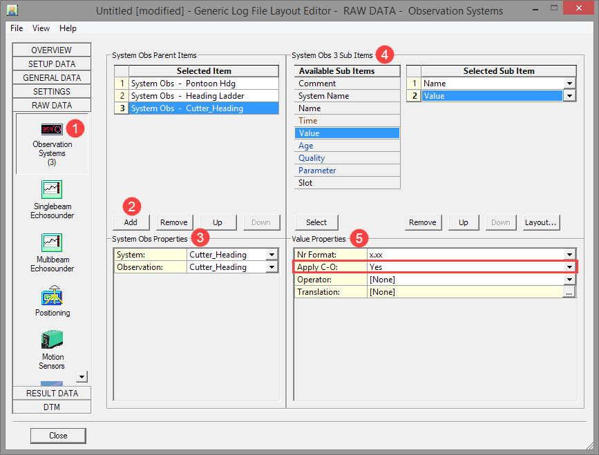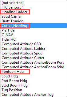 Ladder, spud and cutter headings are all the same as the pontoon heading. These values could be needed in the data string. In our example, the following Observation Systems are available: