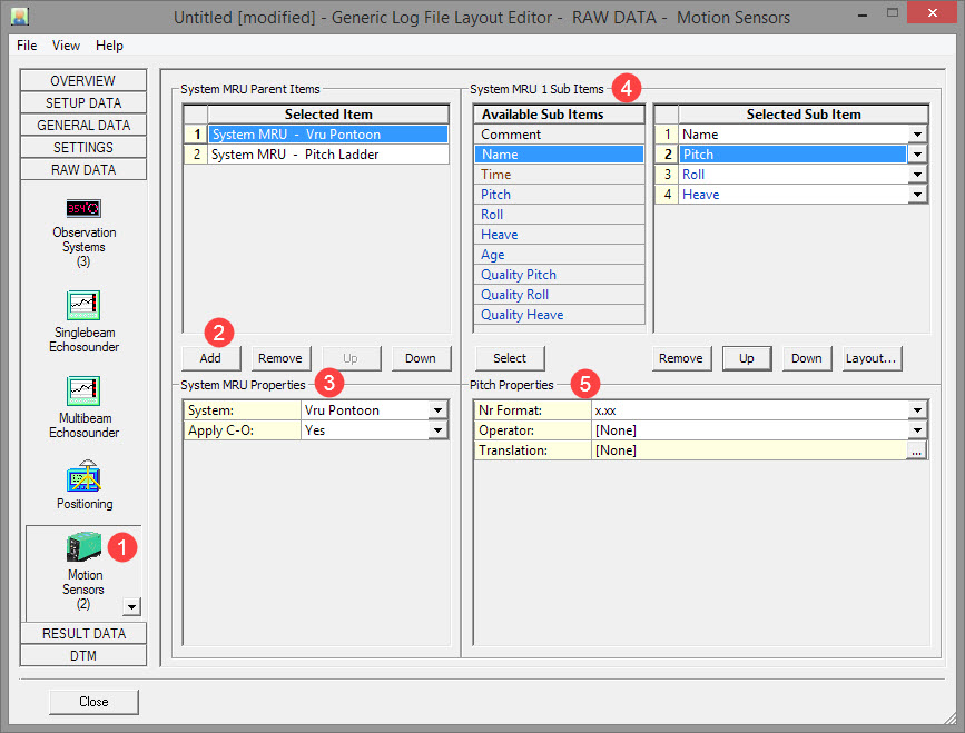 If the log file requires an identifier in order to decode the pitch and roll observations, you could add two 'Comments' as sub-items. Enter the comment string under Properties below.