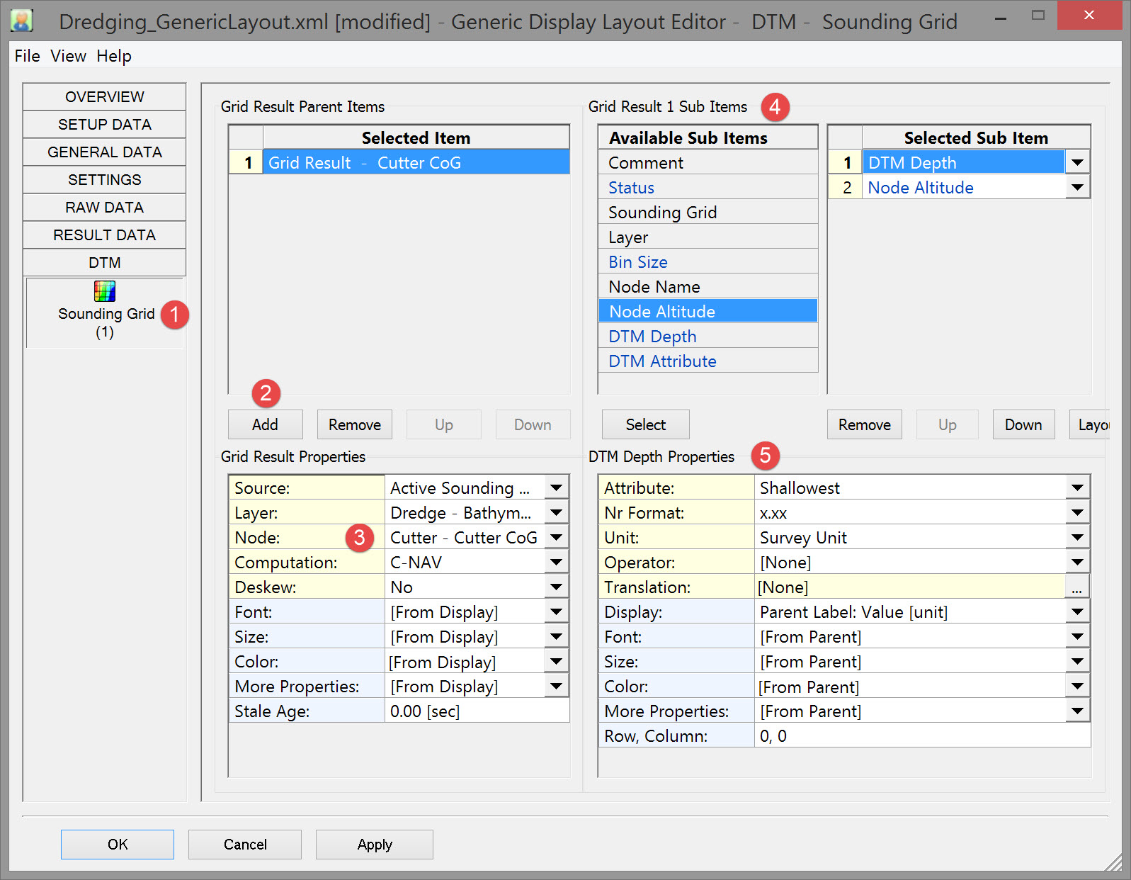 The position of the Node selected is used to extract the appropriate DTM depth value. Altitude is a computed value.