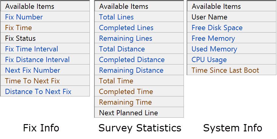 Refer to Fix Info, Survey Statistics, System Info and for further explanation of these items.