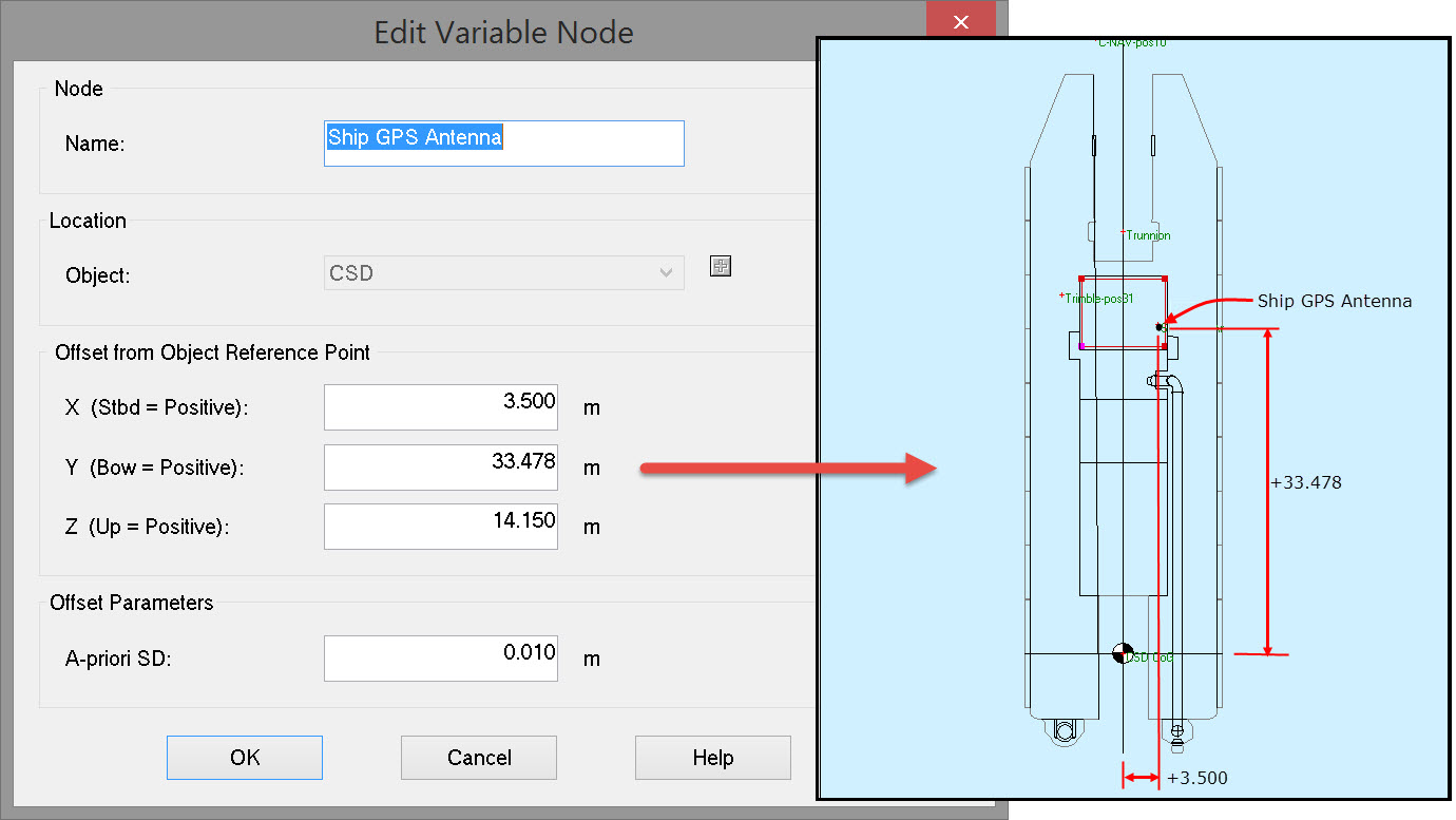 The position navigation system point of measurement (typically the GNSS antenna) is usually not located at the vessel reference point so an additional variable node must be defined.