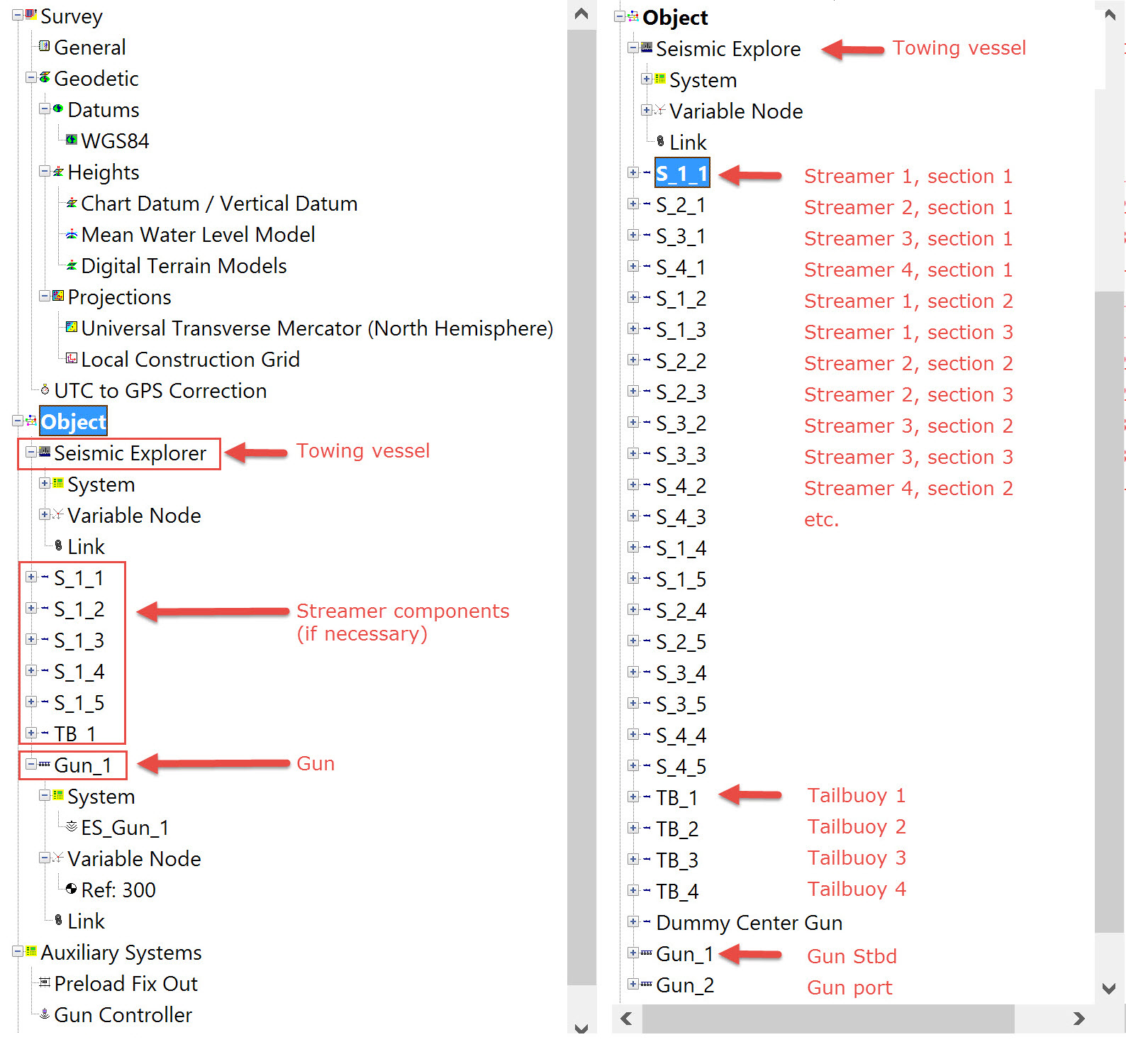 For a simple 2D survey at least three objects need defining; towing vessel, gun and streamer. A tailbuoy may or may not be used. Even if used it may not carry a positioning sensor.
