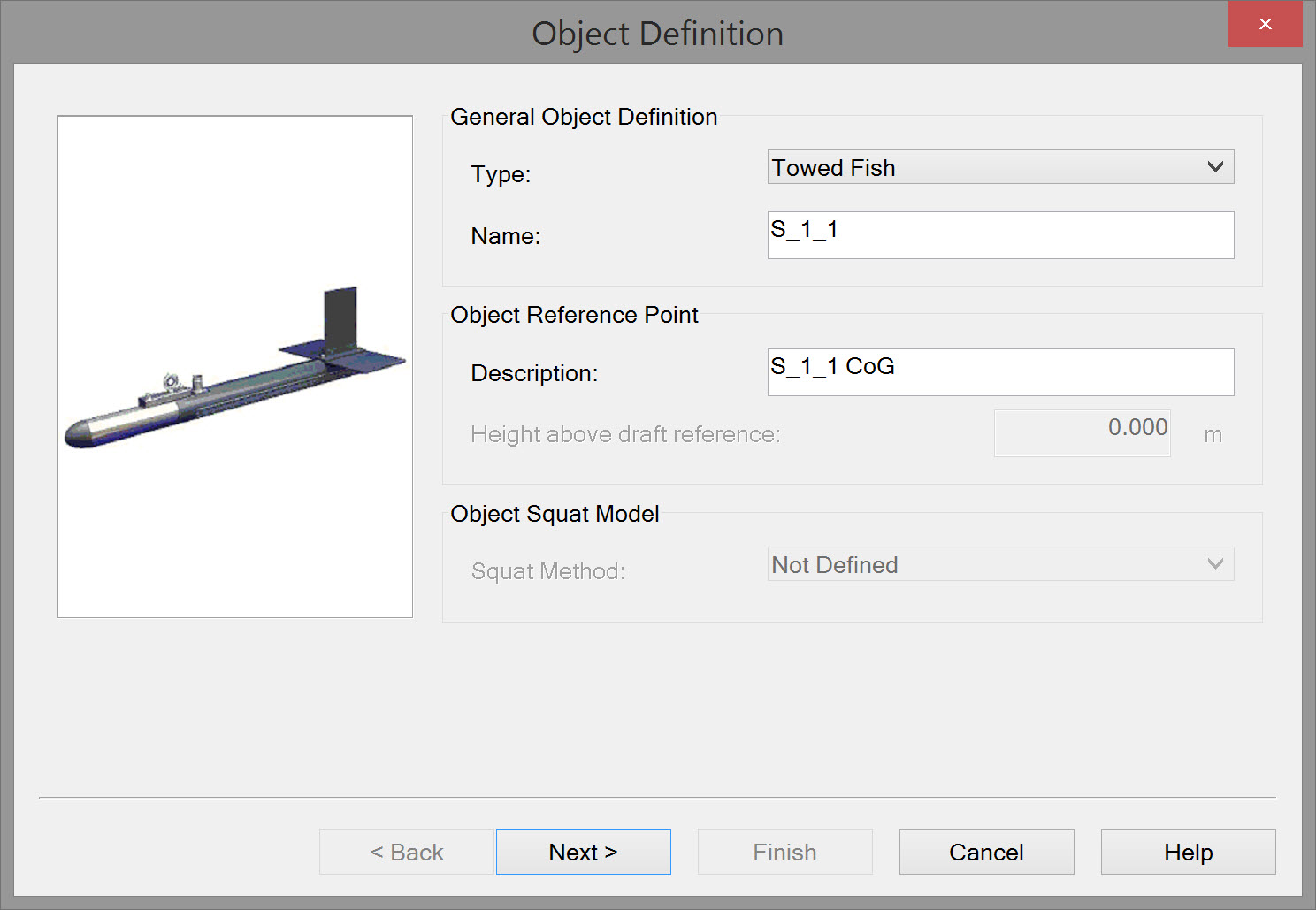 Streamer object type is 'Towed fish' with the CoG located at the head of the segment, i.e. forward end.