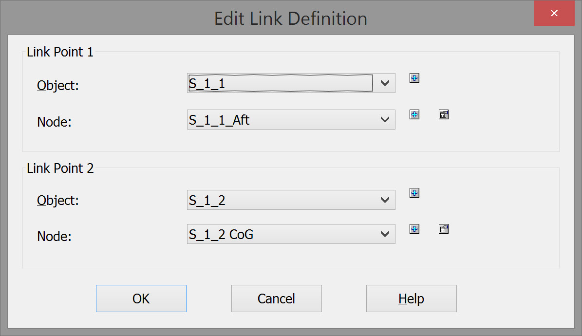 | Link Point 1 | For Object select the most forward streamer section, and for Node select the variable node added to the aft end of this first section. If there is no predefined node add a new one using the Add ![]() |