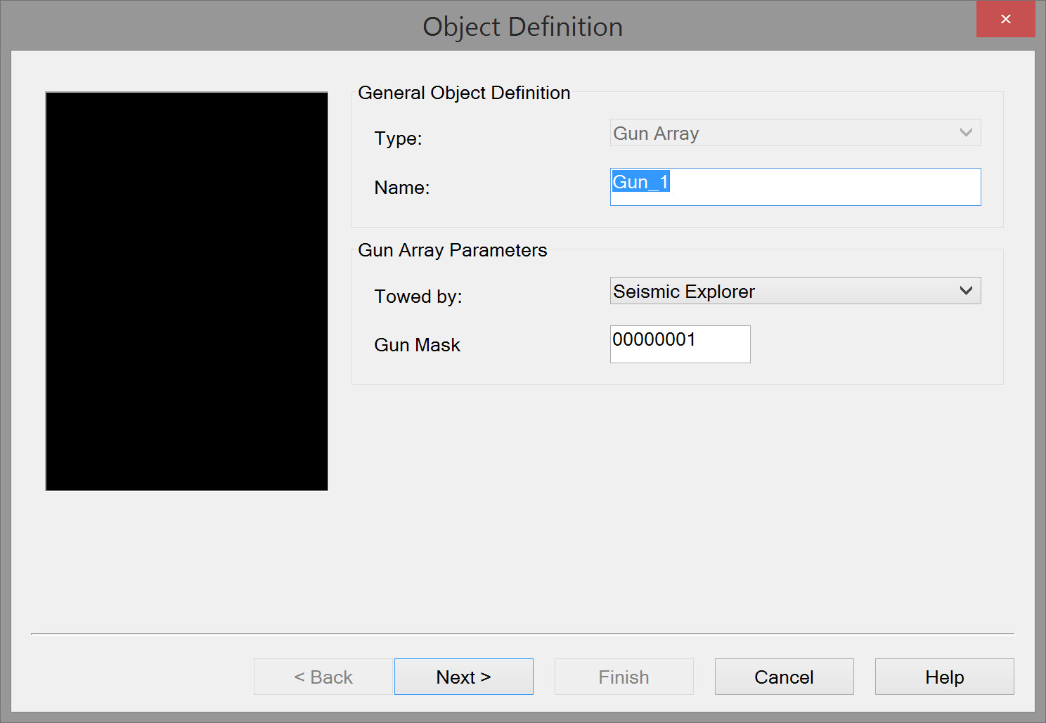 | Name | Enter a name. If multiple gun array objects are defined provide a unique name for each one e.g. Port Gun, Stbd Gun. |