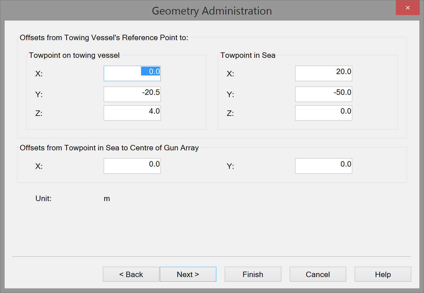 | Offsets from towpoint-in-sea to center of source | Enter the local offsets that reference the center of gun array (source) to the towpoint-in-sea. |