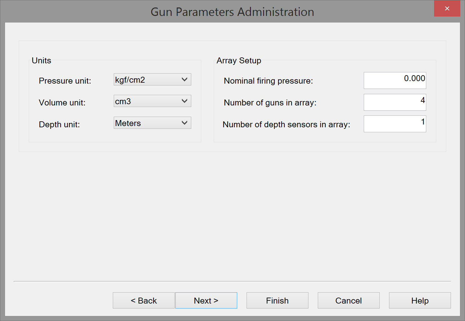 | Units | Select the Pressure units used, Volume unit of the guns and the Depth unit. |