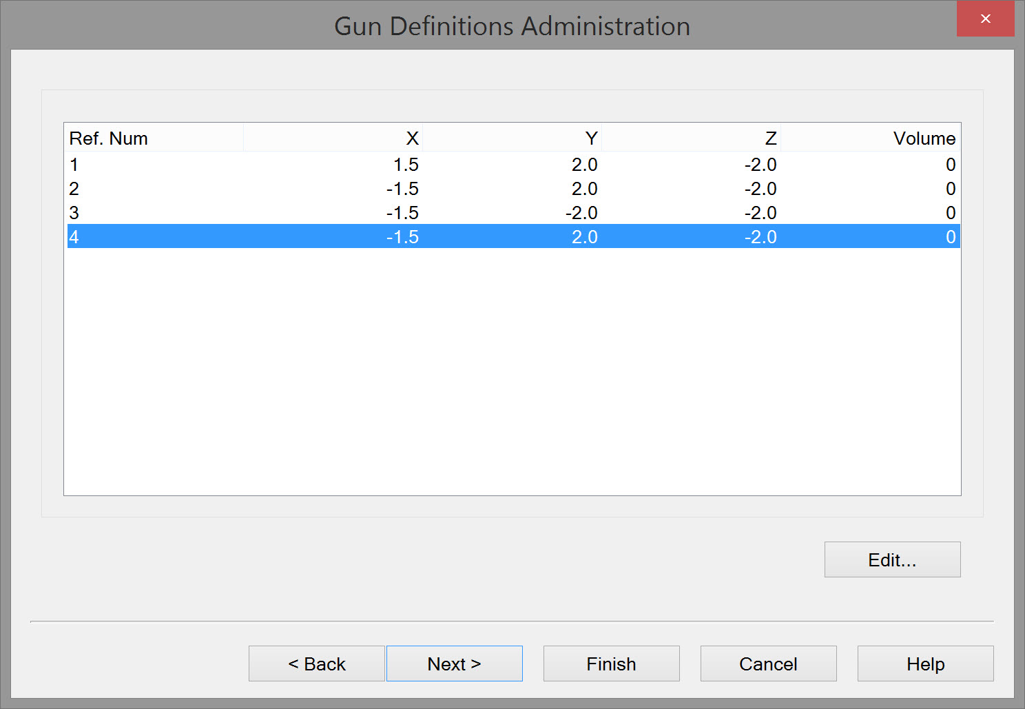 | Gun Definitions Administration | The number of guns listed corresponds to the number entered on the previous page. Select each gun and press Edit, or double click to open the Edit Gun window. Enter the volume of the Gun. |