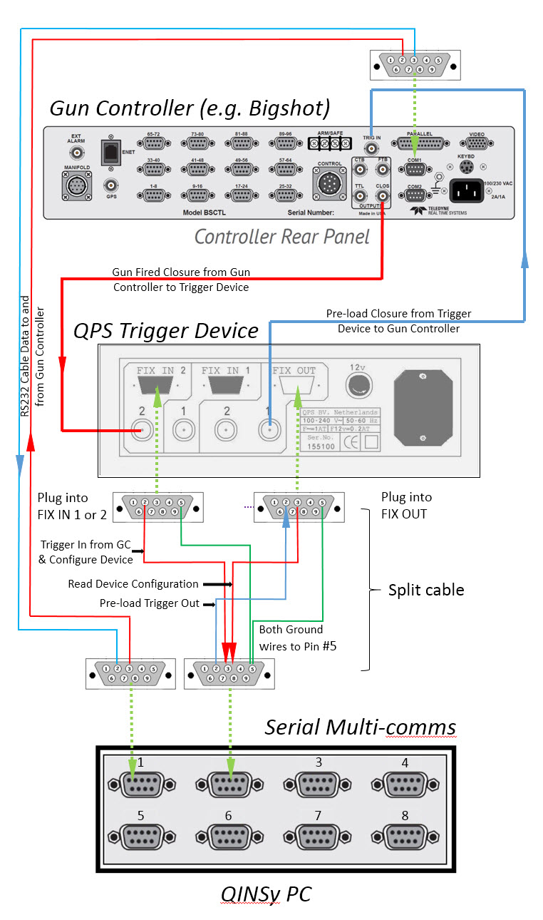 When combining a Qinsy 'Preload Fix Out' to a Gun Controller with a 'Trigger Fix In' from a Gun Controller the cable between the Qinsy PC and the trigger Device should be split so that it can be connected to two serial ports at the Trigger Device end.