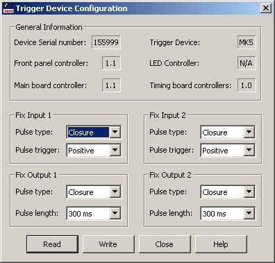 Configuring a QPS Trigger Device is as easy as selecting the correct configuration from the drop downs and clicking on the "Write" button. If Necessary the user can perform a read out of the configuration by clicking on the "Read" button.