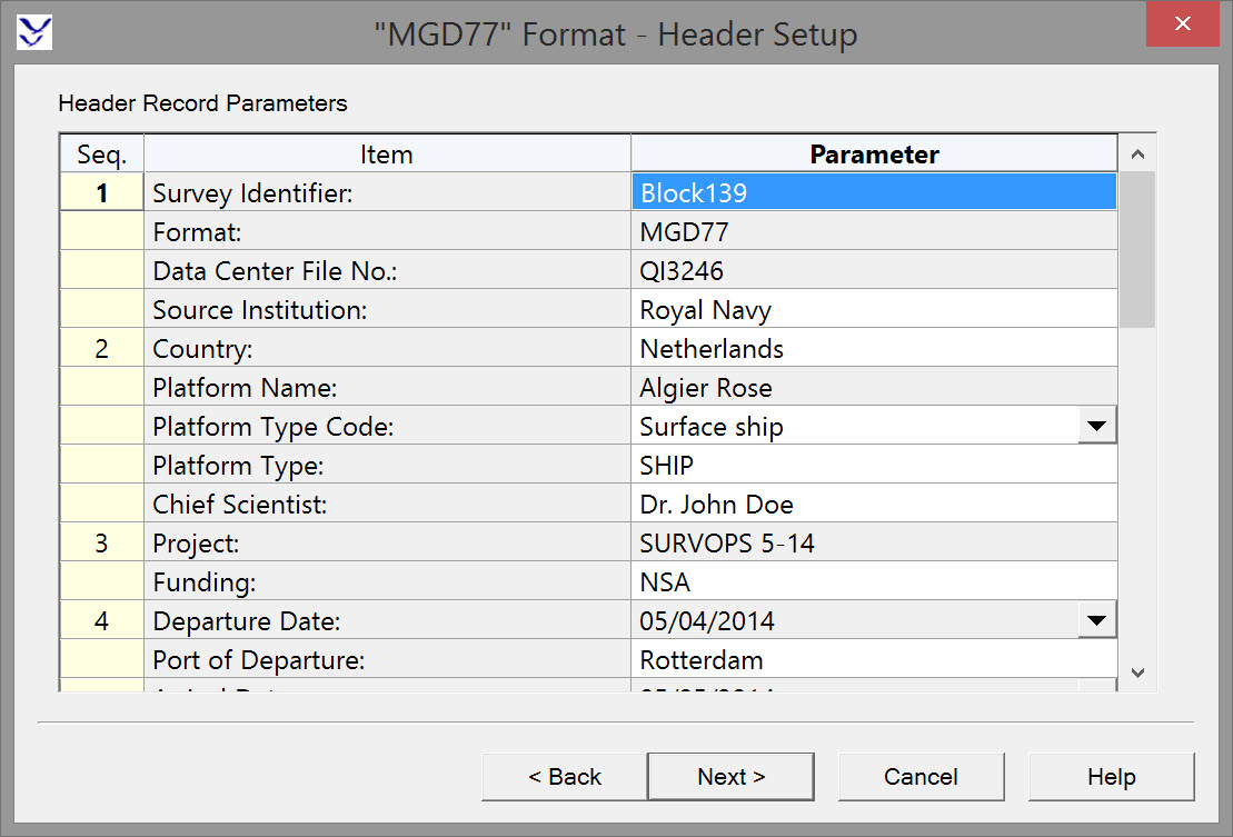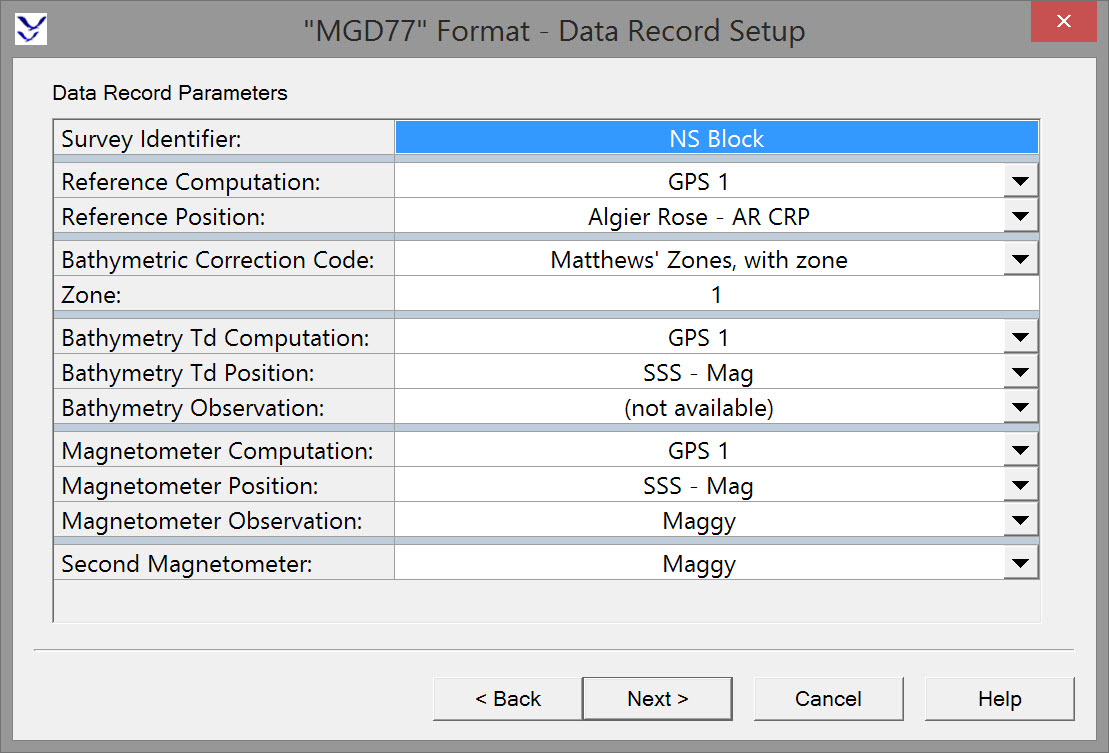 | Format: | Read from the Format Name entered in DbSetup - General - Media & Format Specification. Typically this would be set to"MGD77". | |