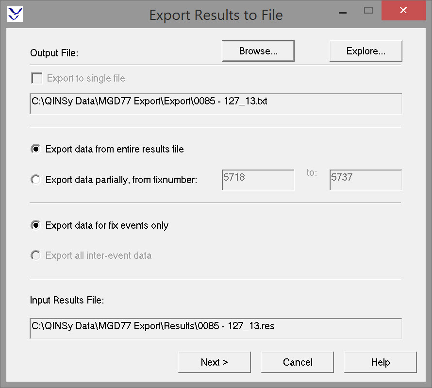| Export data partially, from fix number | By default the first and last fix recorded in the *RES file are displayed. This option allows the fix range to be modified, which might be the case when fixes on the line run-in and run-out are not required in the MGD77 file. |