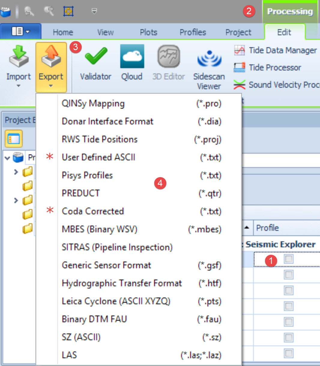 Each format has its own wizard in which settings for export are defined. More information is available at in Qinsy Help pages - Survey Manager - Ribbon Tab Processing - Import and Export.