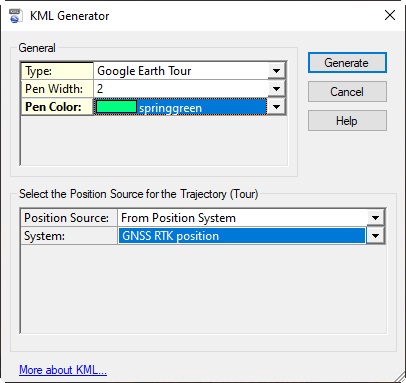 The KML Generator dialog will be invoked. You may stick to the defaults, or select another pen width and /or color.