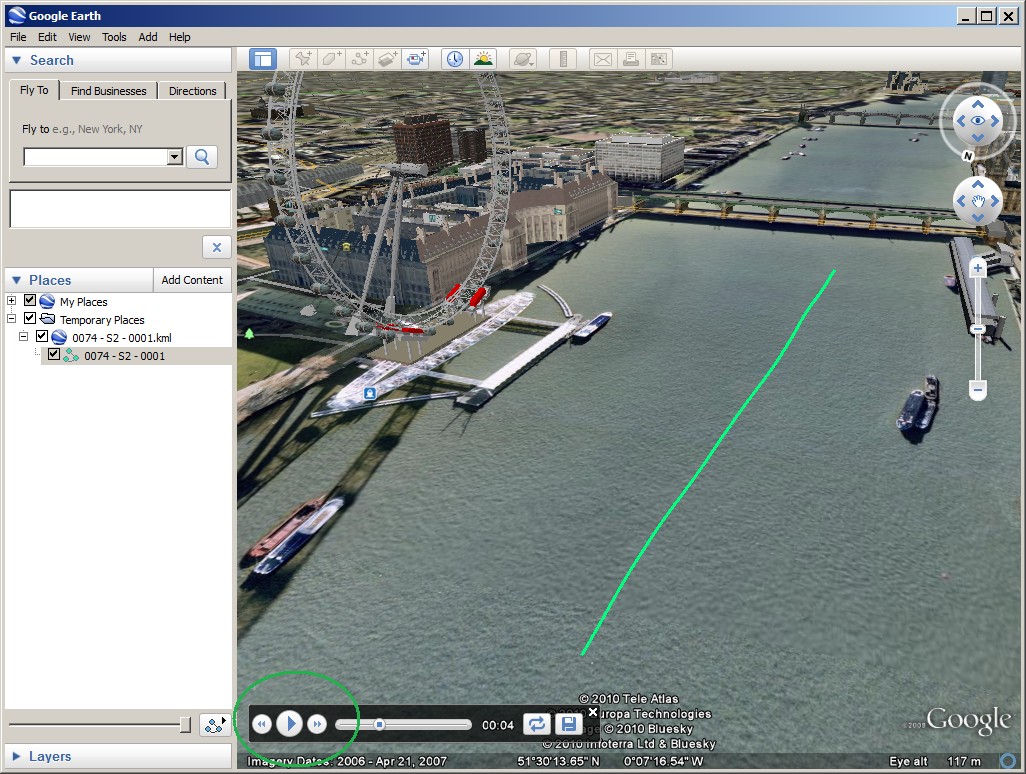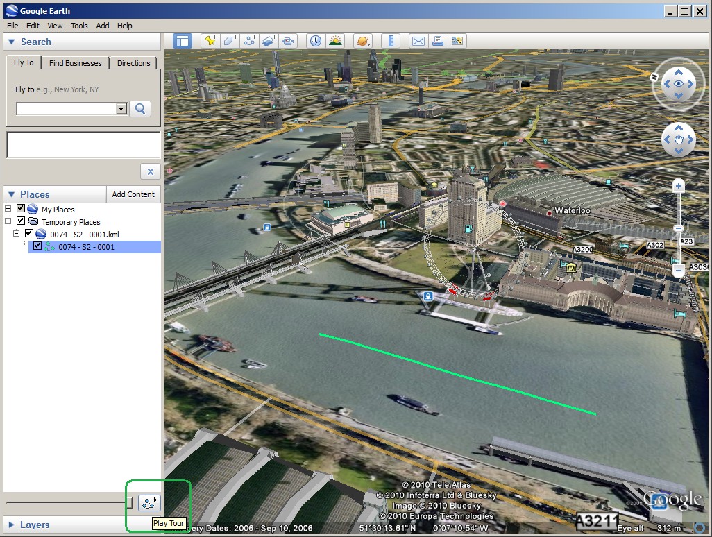 In the Temporary Places you will find the trajectory. Highlight the track, and hit the 'Play Tour' button.
