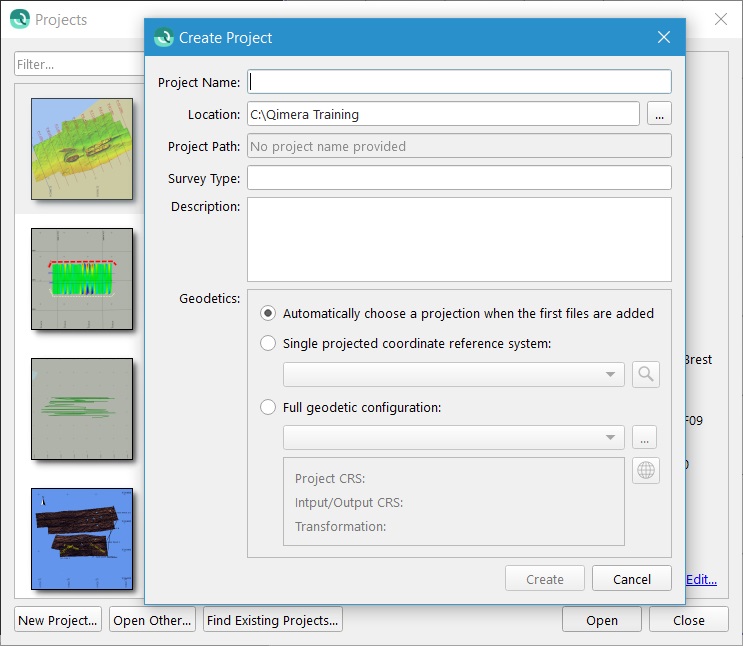 The Create Project dialog has a common look and feel between Qinsy and Qimera, but the lower section of the dialog where geodetics settings are configured varies slightly. This is done in order to accommodate different workflows that existed in the two products prior to the creation of the Geodetic Configuration User Interface.