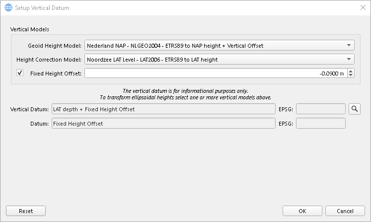| Chart Datum Name | The name of the Chart Datum (also referred as Vertical Datum or Geoid Height Model) as selected in the Vertical CRS Setup dialog of the Geodetic Wizard. When using property Parameter 'Short', the first part of the full name will be omitted. | text |